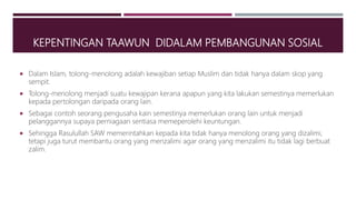 Dan bertakwalah kamu kepada Allah sesungguhnya Allah amat berat siksa-Nya Al Quran surah Al-Maidah ayat 2 Bentuk taawun dalam kehidupan. Akhlak seorang Muslim yang saling memberi dan memperkuat sesuai kemampuannya. Lawan dari sifat tawadhu adalah takabur sombong.